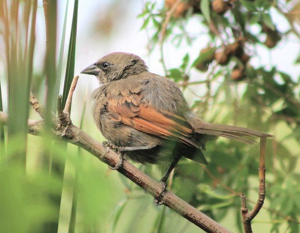 Bay-winged cowbirds are a medium-sized species of New World blackbird . They are largely sexually monomorphic, to the point of being indistinguishable in the field, though males tend to be slightly heavier (Fraga 1992; Jaramillo and Burke 1999). However, an old source (Hamilton and Orians 1965) seems to indicate a small but statistically significant difference in body mass between the sexes. This species is characterized by a light gray body and a charcoal gray tail. The wings are mostly rust-colored, though the retrices (flight feathers) are tipped brown. The legs and claws are black, as are the lores. The black lores and face combine to create what has been aptly described as a âmaskâ. The bill is short, conical, and black; Jaramillo and Burke (1999) note that the bill is âfinch-likeâ in size and shape.