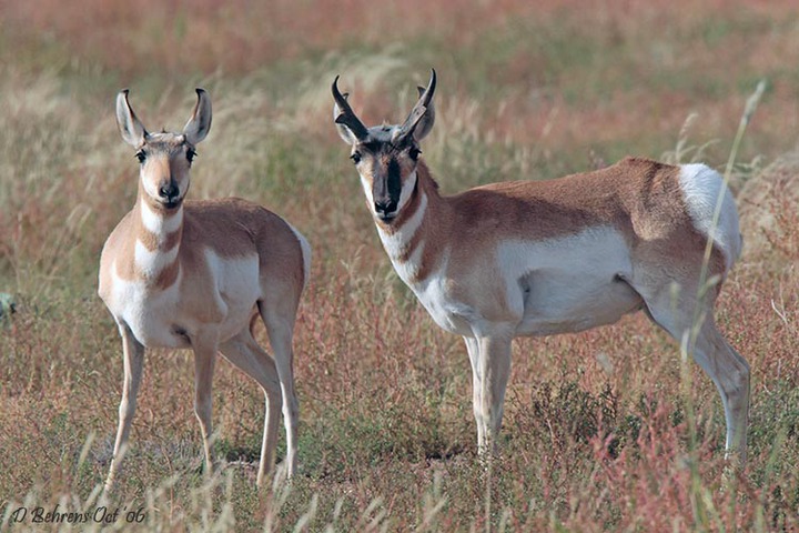 The modern pronghorn is found in the deserts and dry grasslands of western North America. Pronghorns are of medium size, with a head and body between 1 and 1.5 m in length and a weight up to around 60 kg. Their body is stocky and they have long, thin legs. Their coat is pale brown dorsally and whitish ventrally, and they have distinctive black and white markings on their heads and necks. The pelage is dense and excellent insulation against both heat and cold. Their most distinctive feature is their horns , which are like those of bovids in that they consist of a keratinous sheath over a bony core, but differ because the keratinous sheath is shed periodically (annually in males, irregularly in females). These horns are erect and consist of two branches or prongs, a short branch extending forward and located around halfway up the horn, and a longer, backwardly directed tip.