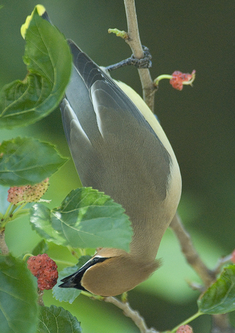 During the summer months, cedar waxwings switch to eating mostly insects. Often, the