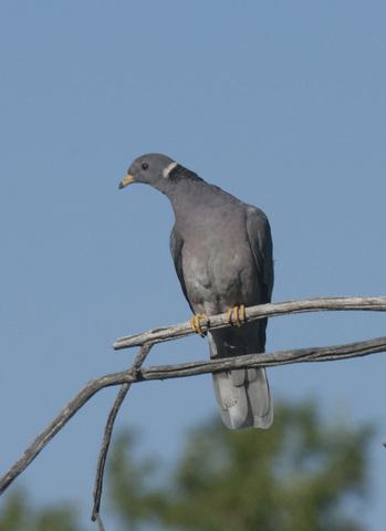 The Band-tailed Pigeon is a medium sized bird weighing up to 340 g (12 oz) and reaching a length of 39 cm (15 in). The head is small, with a linear bill, and broad neck. The bill and feet are yellow with black markings on the tips. The coloration varies from a purplish-grey on the head and upper body, to a brownish slate blue on each side of the breast. Its underside grades from the darker purplish-grey at the top of the breast, to near white at the tail. As its name implies, the Band-tailed Pigeon has a black band across its tail feathers. A thin white band appears on the back of the neck in adults, extending to just behind the eye on each side. In direct sunlight, iridescent greens and purples can be seen on the neck and breast. Feathers are of medium length with broadly arched tips. Females are similar to males, with markings less pronounced. (Audubon, 1995; Encarta, 2001; Readers Digest, 1990)