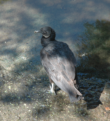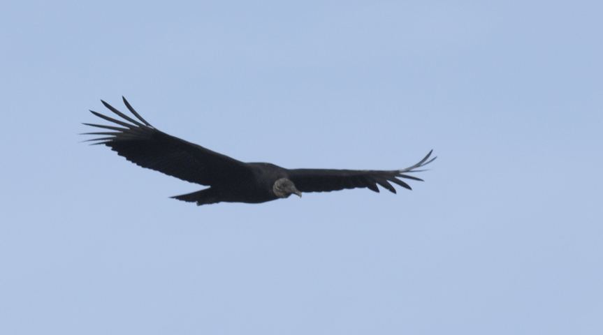 The Black Vulture is black, large bird with a wingspan of 137-152 cm, a length of 50-69. The sexes are alike and the adults and the young have black, wrinkled bare skin on the head and neck. Adults have brown. Black Vultures have weak feet, adapted more for running than for clutching and relatively weak bills. The black vulture's feet stretch past its short tail. In flight, a short, square tail and a large white patch on the undersurface of the wing at the base of the primaries distinguishes them from turkey vultures, another large new world vulture which often occurs in the same area. These birds have been observed to live as long as 21 years in captivity and the oldest wild captured banded bird was 16 years old.