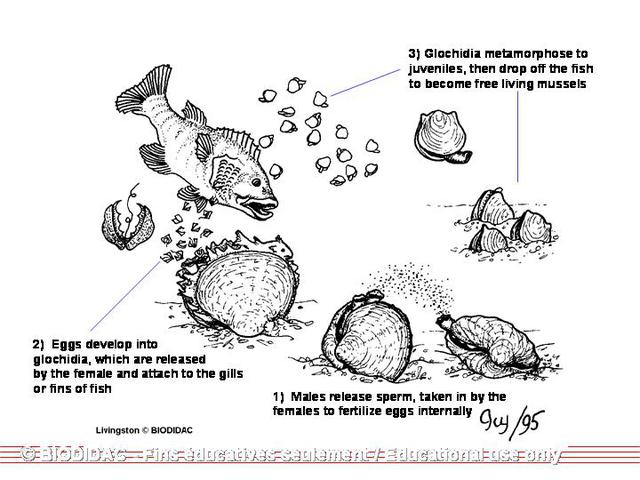 In general, gametogenesis in unionids is initiated by increasing water temperatures. The general life cycle of a unionid , includes open fertilization. Males release sperm into the water, which is taken in by the females through their respiratory current. The eggs are internally fertilized in the suprabranchial chambers, then pass into water tubes of the gills, where they develop into glochidia.
