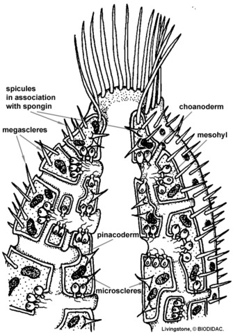 Within the mesohyl of demospongians may be spicules of both megascleres and microscleres with one to four rays, dispersed collagenous fibers (spongin), both, or neither. Members of Demospongiae are easily distinguished from those of the Hexactinellida because they have no six-rayed spicules. They possess a leuconoid structure, with a folded choanoderm . The pinacoderm is continuous, and the mesohyl is characteristically thickened. The thicker the mesohyl, the more diverse the forms of Demospongiae.