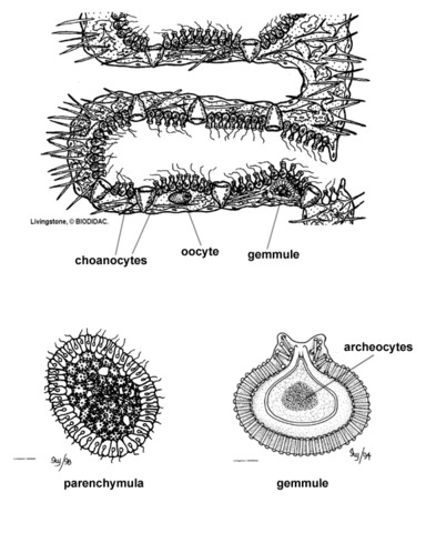 The Demospongiae can reproduce both sexually and asexually. In sexual reproduction, spermatocytes develop from the transformation of choanocytes , and oocytes arise from archeocytes . Repeated cleavage of the zygote egg takes place in the mesohyl and forms a parenchymula larva with a mass of larger internal cells surrounded by small, externally flagellated cells. The resulting swimming larva enters a canal of the central cavity and is expelled with the exhalant current. Methods of asexual reproduction include both budding and the formation of gemmules . In budding, aggregates of cells differentiate into small sponges that are released superficially or expelled through the oscula. Gemmules are found in the freshwater family Spongellidae. They are produced in the mesohyl as clumps of archeocytes, are surrounded with a hard layer secreted by other amoebocytes. Gemmules are released when the parent body breaks down, and are capable of surviving harsh conditions. In a favorable situation, an opening called the micropyle appears and releases amoebocytes, which differentiate into cells of all the other types.