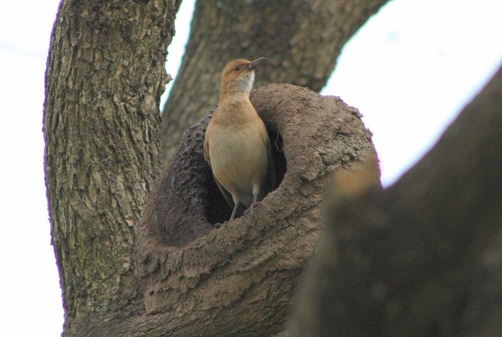 Nest construction may begin months before the breeding season. Ovenbird nests are quite variable. They can take from two weeks to three months to build and can weigh up to five kilograms. Ovenbirds build three different types of nests: adobe mud nests, nests in cavities and domed nests. Adobe nests look like ovens and are the root of the birds’ name. These nests are made of mud, plant material and dung and are usually lined with grass. Cavity nests are usually placed in a woodpecker hole or a natural cavity, or are a burrow that is usually a long tunnel, up to one meter into a cliff or bank. It is not known if all the burrow nesting species excavate the tunnels or if some use tunnels dug by rodents or other animals. These nests are lined with grass, woodchips, spider web and other materials. Domed nests are made of vegetation such as sticks and grass. Some species use twigs from thorny plants, making the nests difficult for predators to destroy. The birds also use barbed wire, snake skin, feathers and bone as nest materials. Nests are built in cactuses or thorny vegetation or hanging from branches, and can be up to two meters long. Some nests have tubular entrances 30 to 40 cm long. Ovenbird nests are usually enclosed and provide protection from predators.