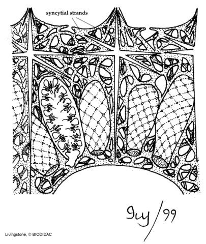 It is upon close internal examination that glass sponges can be most easily distinguished from other sponges. The skeleton of an hexactinellid is made entirely of silica. These siliceous spicules are generally composed of three perpendicular rays (and therefore six points, so they are described as hexactine), and are often fused, lending hexactinellids a structural rigidity not typical of other sponge taxa. Strung between the spicules is a largely syncytial network of soft body cells. Incurrent water enters the body through spaces in the syncytial strands . Within the syncytia are units functionally similar to the choanocytes found in other sponges but these units completely lack nuclei, and so are referred to as collar bodies rather than collar cells. They are flagellated, and it is the beating of their flagella that causes the current to pass through the sponge. Within the syncytia are cells functionally comparable to archaeocytes in other sponges, but these cells seem to demonstrate only limited mobility. Hexactinellids lack myocytes completely, and so are incapable of contraction. While hexactinellids possess no nerve structure, they seem to be able to send electrical signals across the body through the syncytial soft tissue.