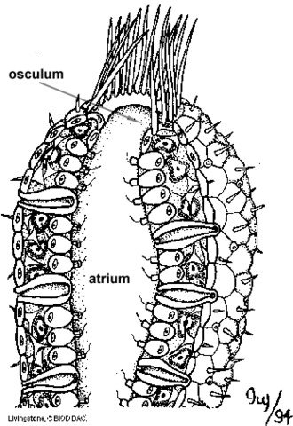 All glass sponges are upright, and possess specialized structures at their bases for holding fast to the ocean floor. Most appear outwardly to be radially symmetrical; they are typically cylindrical, but may also be cup-shaped, urn-shaped, or branching. The average height of a hexactinellid is between 10 and 30 cm, but some can grow to be quite large. A hexactinellid possesses a cavernous central cavity (the atrium ) through which water passes; a cap of tightly woven spicules covers the osculum in some species. Coloration in most is pale. Glass sponges most closely resemble syconoid sponges, but they differ too much internally from other sponges to be considered truly syconoid.