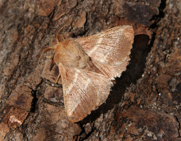 Adult (moth) Eastern tent caterpillars are reddish brown in color and have two creamy white stripes running obliquely across their front wings. Wingspan is approximately 2.5 cm. Adults have siphoning mouthparts, and females are generally larger than males.