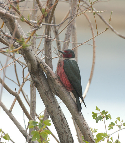 Lewis's Woodpeckers love hot sunshine. They sit on the tops of tall dead trees watching the air for insects. They are rarely heard tapping. They do not sit vertically on the trunk, but crosswise on a branch. They also perch on wires, which other woodpeckers don't do. Lewis's Woodpecker are comfortable on the ground, searching for food and eating there too.