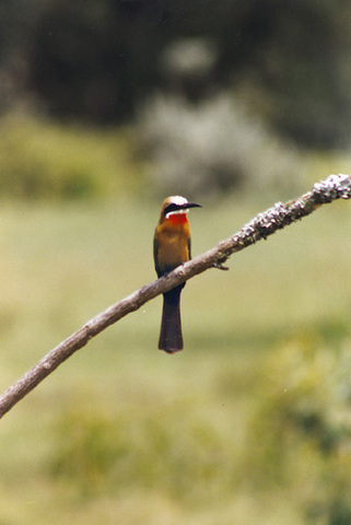The white-fronted bee-eater typically reside in tropical areas, open grasslands, wooded