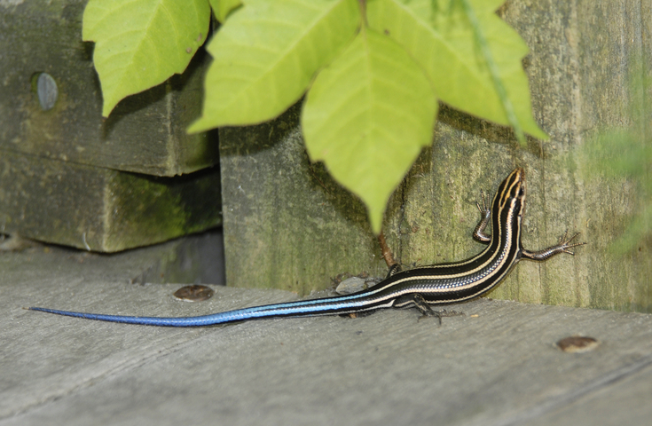 Five-lined skinks also exhibit antipredation behavior. In evasion of various predators including snakes, crows, hawks, shrews, moles, opossums, skunks, raccoons, and domestic cats, skinks may disconnect their entire tail or a small segment. Skinks run to shelter to escape their distracted predators as the disconnected tail continues to twitch. Skinks may also utilize biting as a defensive strategy (Harding 1997).