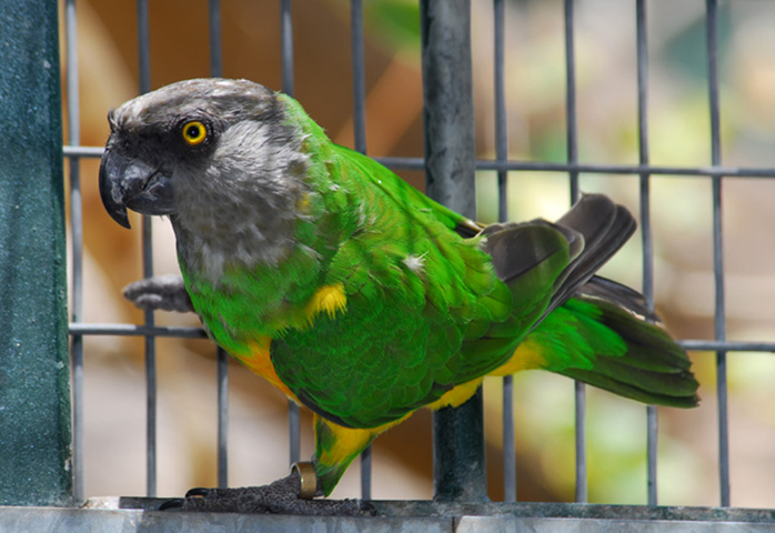 The head of P. senegalus is gray in color, including the beak. The wings, back, tailfeathers and parts of the breast are green (shades of which vary by bird). The green at the breast is in the shape of a "v", making it appear as if the P. senegalus are wearing a vest. The underside (belly) ranges from bright yellow to orange. The eyes, while starting out gray in the young, end up yellow in mature adults. Feet are either gray or pink.