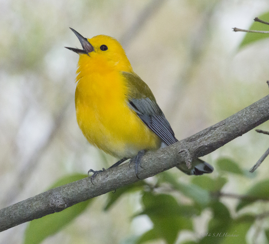 Protonotaria citrea received its name because of its resemblance to the yellow hooded prothonotaries of the Roman Catholic Church. Coloration of P. citrea is a vibrant yellow on the head, neck, and underside. Yellow fades into olive green along its back and then to gray over the lower back and tail. The upperwings are a blueish gray with black at the tips and the underwings white and yellow. The belly fades from yellow to white, coloring the underside of the tail white. Female birds resemble males except they are duller in color, with more olive green tinting the yellow. Males have a black bill, while females have a black upper mandible and a flesh colored or brown lower mandable. Both males and females have dark grey legs and feet, and black eyes (Petit 1999; Terres 1980).
