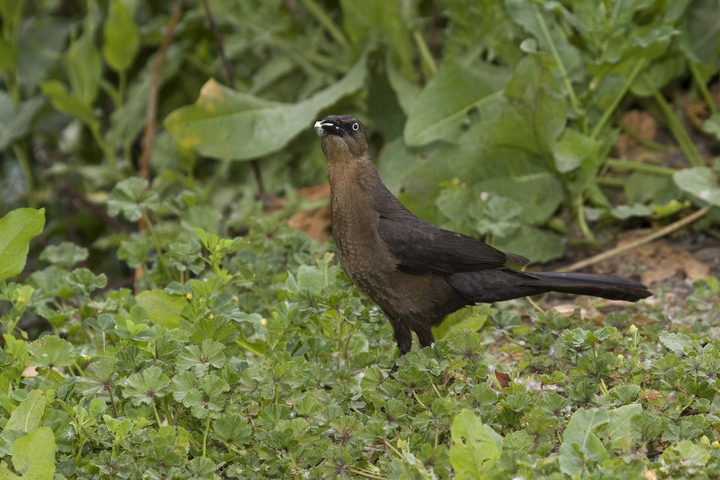 The great-tailed grackle is known to eat insects, lizards, aquatic invertebrates and vertebrates, fruit, grain, and grass seed (Sibley, 2001). They are also known to remove and eat ectoparasites from livestock. Male nestlings appear to require more food than females of the same age (Ehrlich et al., 1988).