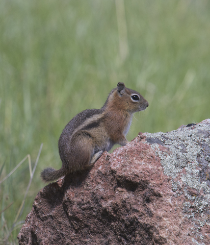 Spermophilus lateralis is found from 1,220 m in the northern Sierra Nevada mountains of California, up to 3,965 m at Pike's Peak, Colorado. This species occurs in mixed coniferous forests of the Klamath, Cascade and Sierra Nevada ranges. Golden-mantled ground squirrels are found up to and above the timberline, provided that there is enough cover for them. Forest-edged meadows and rocky slopes can be occupied, as well as chaparral habitat in southern California. Spermophilus lateralis is abundant in campgrounds in where these squirrels enjoy human handouts.