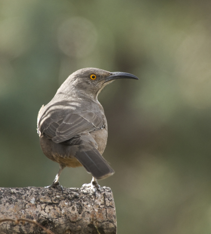 T. curvirostre is an overall brownish-gray bird that quite effectively blends in with its surroundings. The chest is mottled and the tail is dark gray. A very conspicuous characteristic of T. curvirostre is the golden-orange color of its eyes and of course the long curved bill that gives it its name. Both male and female are between 9.5"-11.5" in length; there is no sexual dimorphism evident in this species.