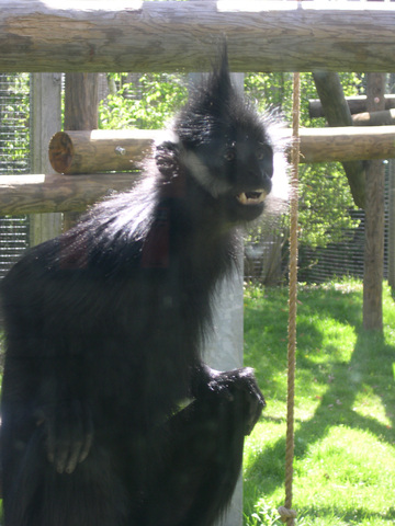Pelage varies from uniformly brown, black, or dark gray with a white stripe running from the corner of the mouth to the ear. White is also present in a crest above the eyes, resembling eyebrows, a feature which distinguishes them from species in the genus Presbytis . Young are golden yellow with a black tail, another feature that distinguishes these monkeys from the black young of Presbytis .