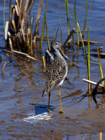 season lesser yellowlegs have grey, black, and white mottled plumage dorsally, white