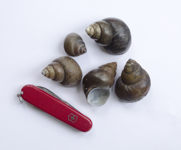 Bellamya sp., from Australia. In the Viviparidae (so named because they give birth to small young snails rather than laying eggs), males lack a normal penis, but instead use a modified right tentacle, which is stouter and usually shorter than the normal left tentacle.